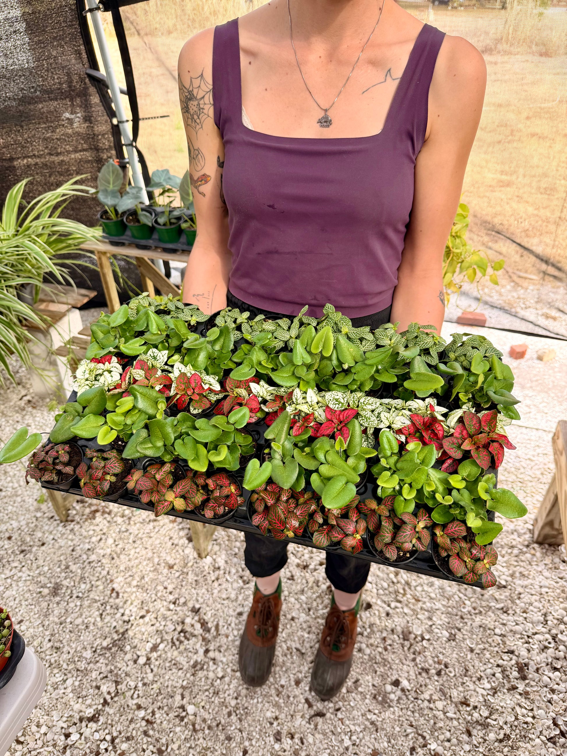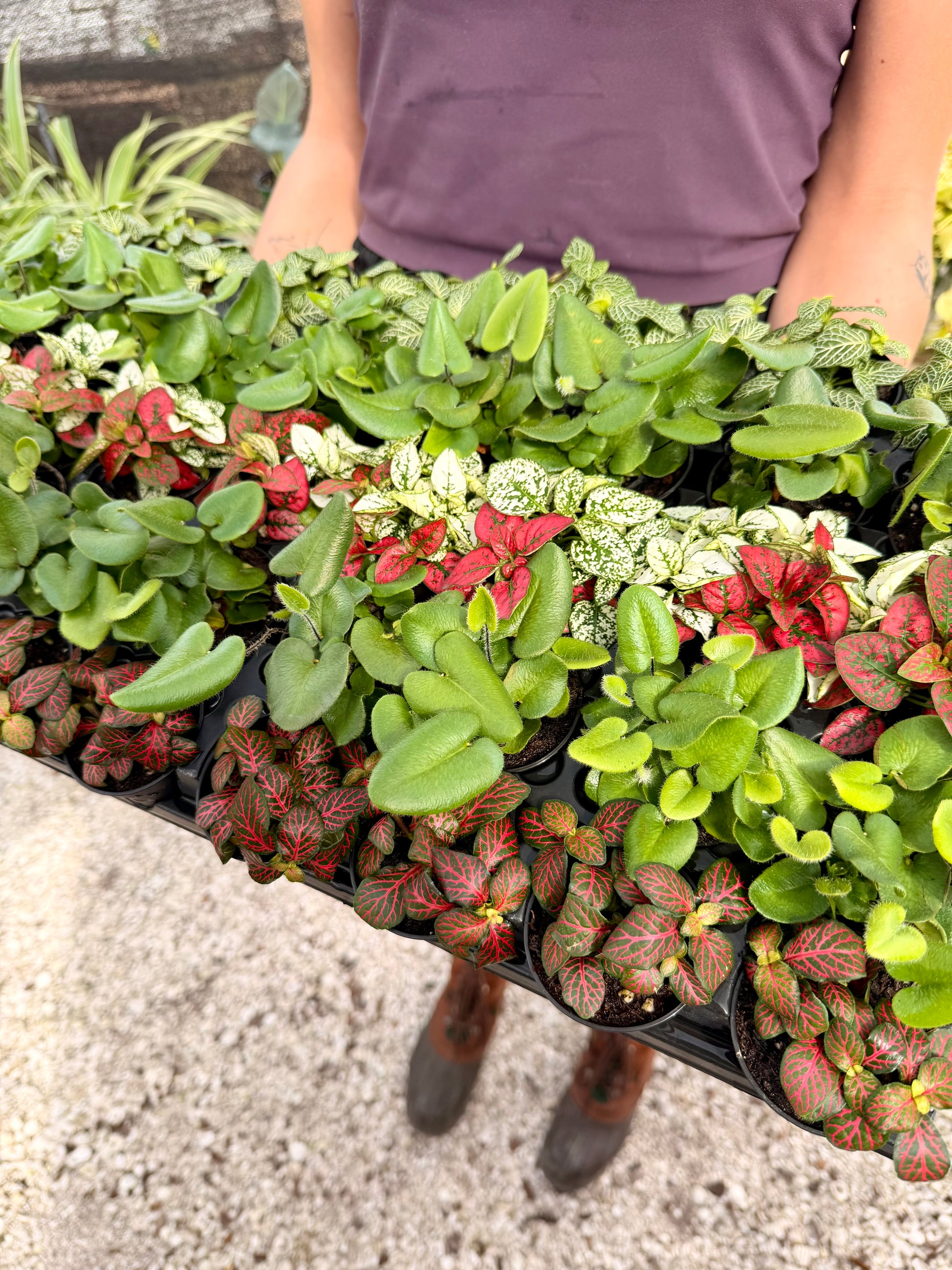 You'll receive 3 of the following: Green Fittonia, Red Fittonia, Heart Leaf Fern, or Polka Dot Plant
